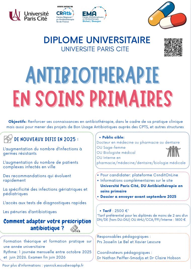 Le DU d’Antibiothérapie en soins primaires a pour but global la promotion du bon usage antibiotique en soins primaires.